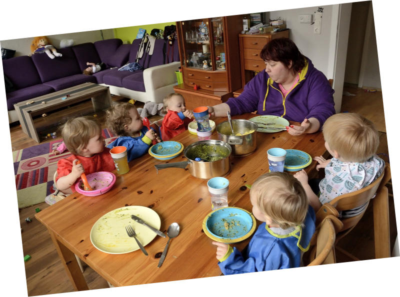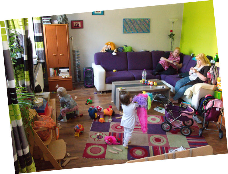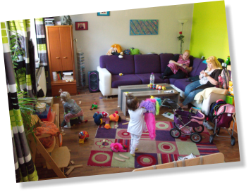 Wir leben in einer geräumigen fünf-Zimmer-Wohnung. Wenn wir denn zu Hause sind, spielt sich das meiste Geschehen in unserem hellen und großen Wohnzimmer und dem Kinderzimmer ab.Hier haben wir Platz zum Spielen und auch mal zum Toben. In der Essecke frühstücken wir gemeinsam und essen Mittag oder wir stellen den Tisch bei Seite und malen und Basteln dort. Auch unsere fünf Degus leben hier. Wenn sie wach sind, beobachten und füttern wir sie gemeinsam. Im Wohnzimmer ist aber auch Platz um in einer gemütlichen Ecke zu kuschel oder sich in Ruhe Bücher anzugucken.